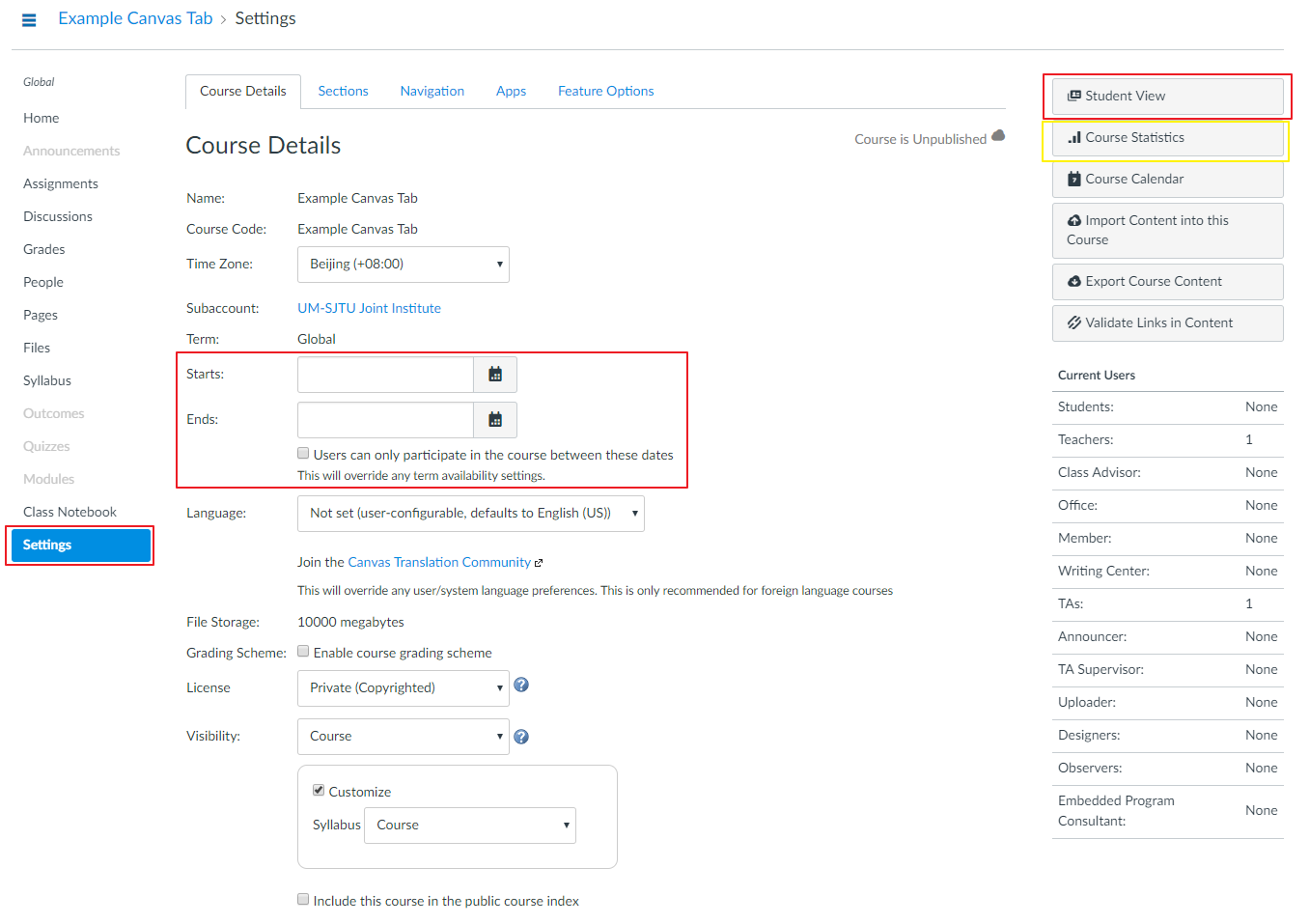 The basic setting contains the starting date and ending date of the course. Instructor can set these two dates to restrict the students' access to the course tab.